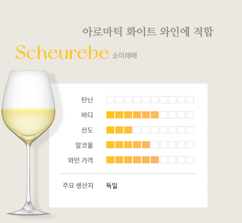 Read more쇼이레베(Schurebe)의 역사는 DNA 프로파일링에서 이 품종이 알려지지 않은 야생 포도와 리슬링(Riesling) 사이의 교배종일 가능성이 있음이 밝혀진 약간의 미스터리함을 가진 품종입니다. 블랙커런트, 복숭아, 잘 익은 배를 연상시키는 강렬한 부케로, 다양한 숙성도에서 다양한 스타일의 와인을 생산할 수 있고 산도있는 드라이한 식전주부터 달콤한 디저트 와인까지 만들수 있으며, 향이 풍부하고 매운 음식과 잘 어울립니다. 최근에는 소비뇽 블랑과 상당히 유사한 프레시한 드라이 스타일의 쇼이레베를 생산하는 경향이 증가하고 있습니다. 라인헤센에서 이 품종을 재배했으며 독일 최대의 와인 재배 지역인 라인헤센 지역이 품종의 본고장입니다.