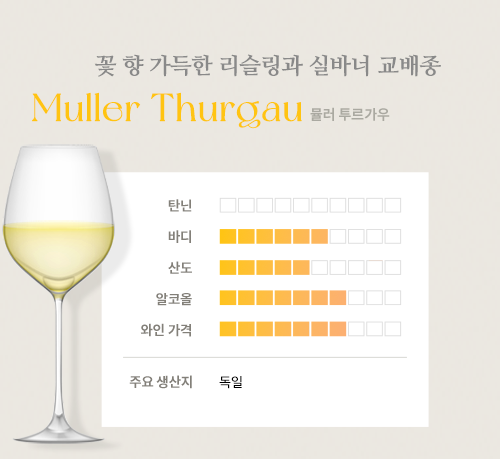 1880년초 개발된 리슬링과 실바너의 교배종으로 독일에서 가장 많이 재배되는 품종 중 하나입니다. 조기 숙성되어 생산량이 많고 품종표시가 없는 중급의 독일 와인은 이 품종의 비율이 높습니다. 리슬링보다 부드러운 산미와 뮈스카와 유사한 꽃향기를 느낄 수 있습니다.
