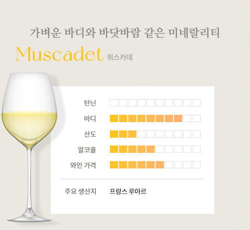 가볍고 산미가 살아있는 아주 신맛의 와인으로 Sur lie라는 방법으로 제조되며, 16세기 부르고뉴 지방의 믈론 드 부르고뉴종을 이식한 것으로 알려져 있습니다. 가벼운 바디감의 드라이 와인으로 해산물과 잘 어울립니다.